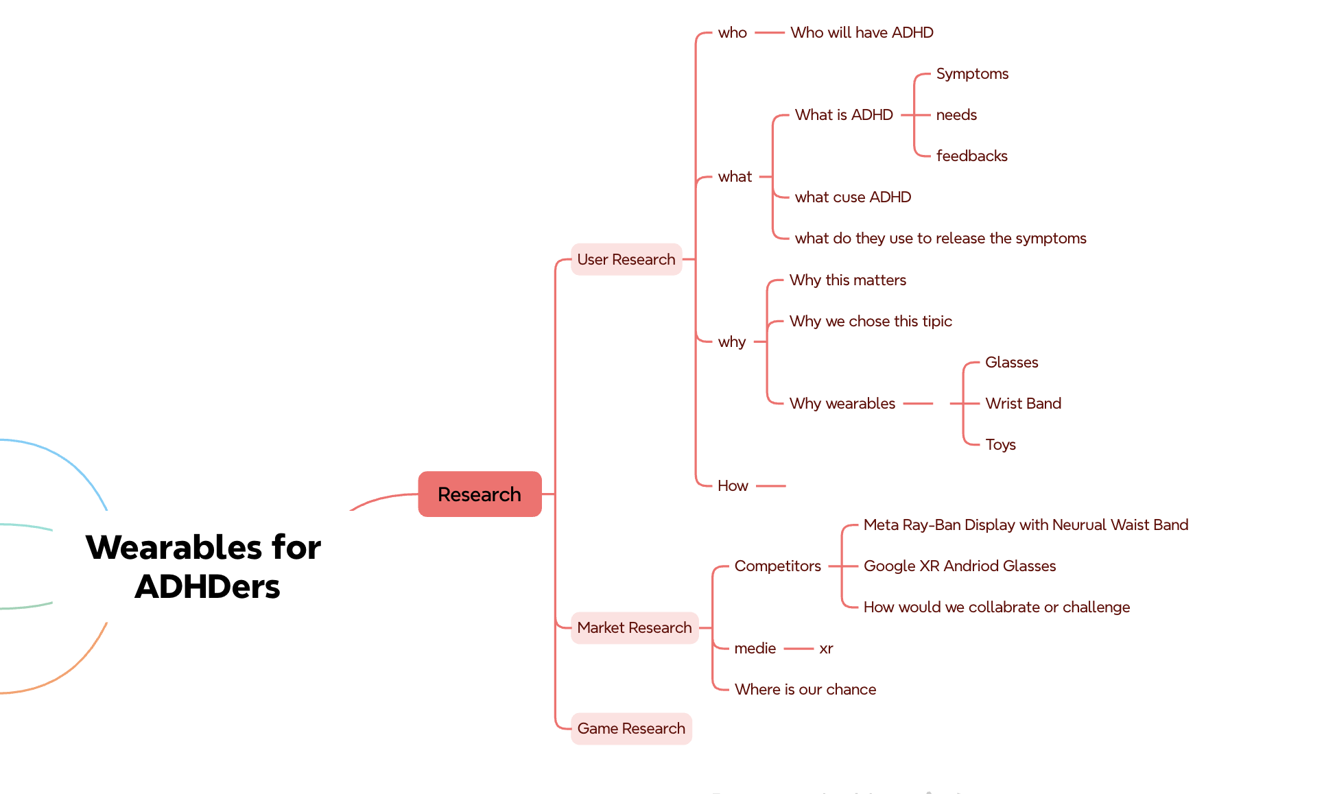 For the UX design research project, our group (Linzhi, Sid, and I) decided to research wearables for ADHDers. We plan to separate the research into three parts: user research: what is the thing that people with ADHD need the most; market research: what are similar products on the market that we can study from or collaborate with; and game research: what are some game mechanics that we can implement into our product.